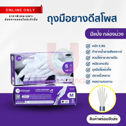 ถุงมือดีสโพสมีแป้ง Latex glove (กล่องม่วง) Sritrang : ถุงมือยางธรรมชาติ แบบมีแป้ง ใช้ได้ครั้งเดียว ผลิตจากน้ำยางธรรมชาติ ยืดหยุ่น ทนทาน สวมใส่สบาย